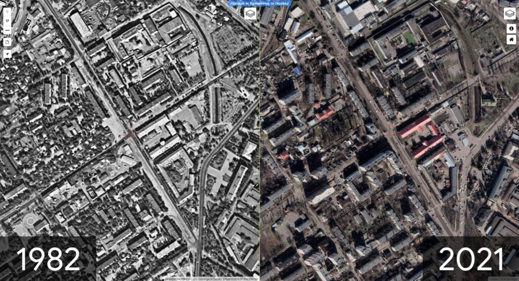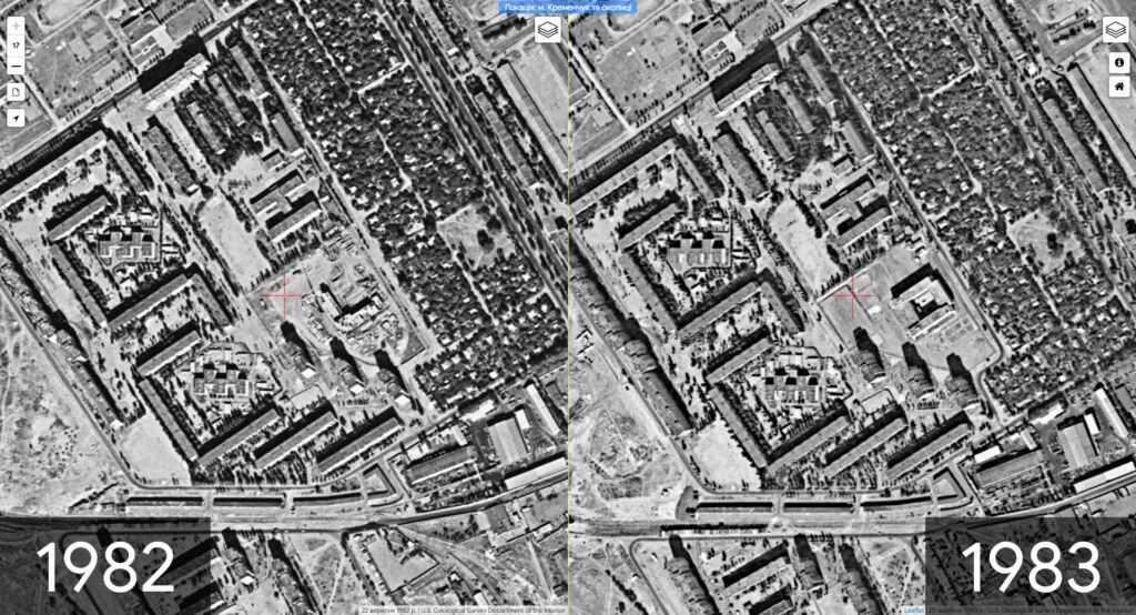 Знімок 1982 року також можна порівняти з подібним, тільки 1983 роком, який вже існує в локації Кременчука. Причому різниця в датах між ними практично рік – 22 вересня 1982 і 20 вересня 1983-го. За рік глобальних змін у місті майже не відбулося, хіба що будівництво окремих будівель. Наприклад Ліцей №30: