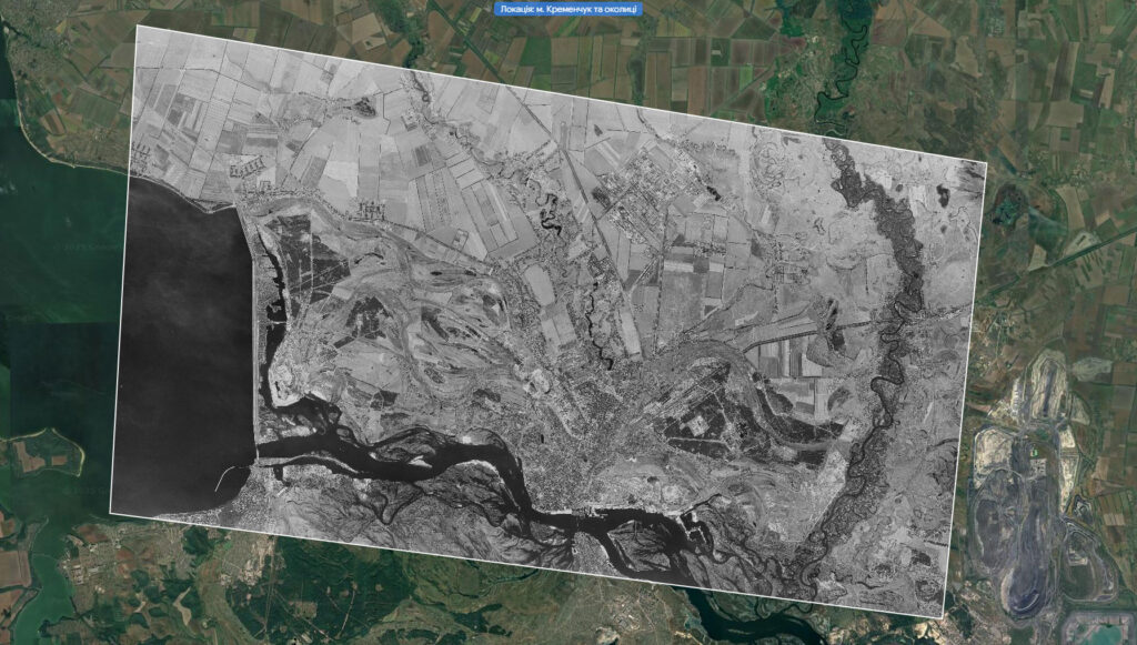Новий дуже деталізований знімок з великим покриттям з’явився в панелі шарів локації Кременчук. Покриття від греблі водосховища до Дмитрівки з заходу на схід і від Литвиненків до Кременчука з півночі на південь: